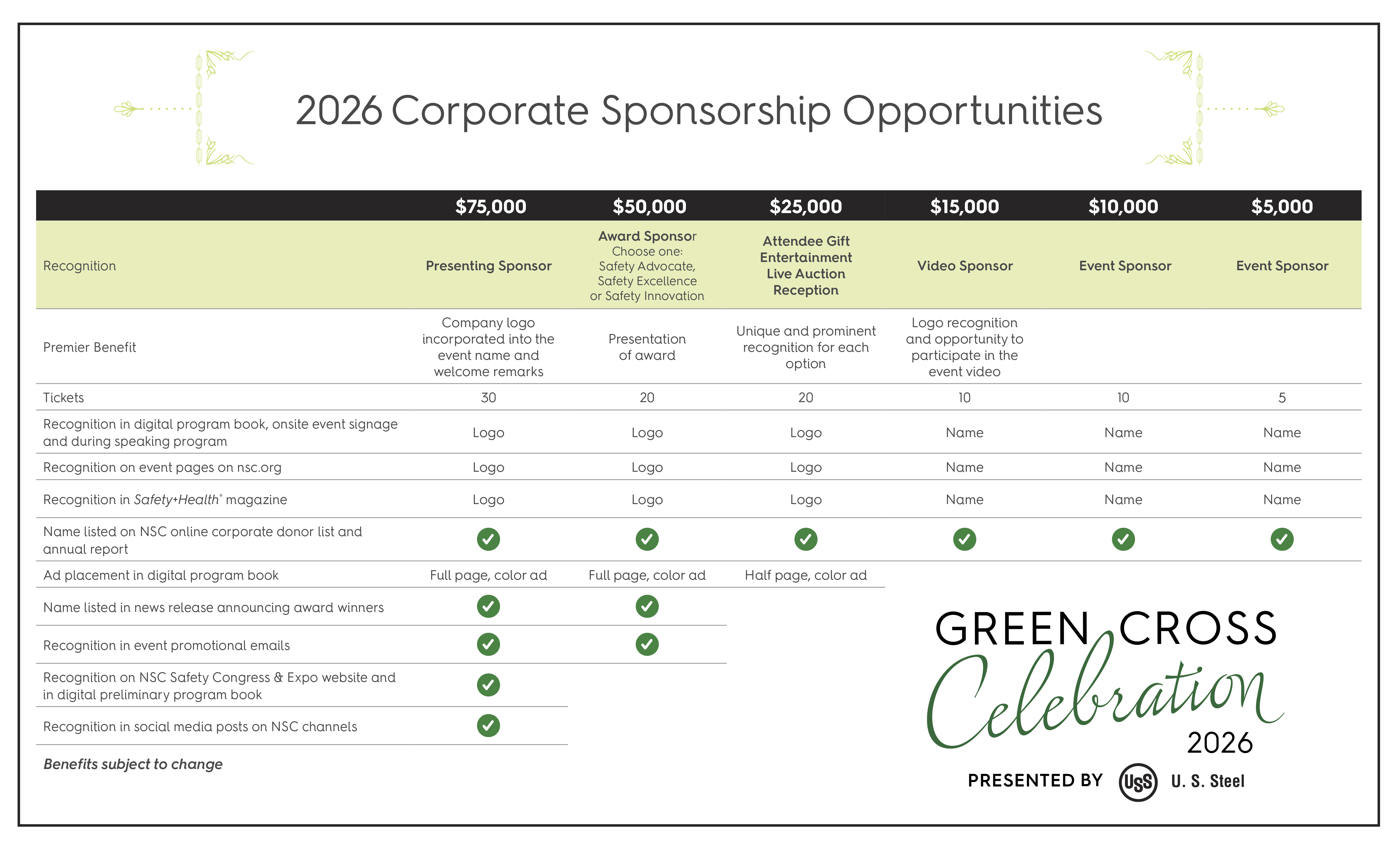 Support from the corporatecommunity plays a vital role in fundingcritical mission initiatives at NSC. By sponsoringthe Green Cross Celebration, you are helpingrecognize safety leadership and aligning yourorganization with the nation’s leading safety advocate.